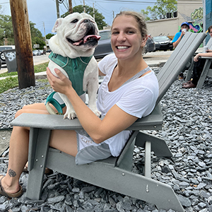 Madeline’s Intermediate Accounting II class Out at dinner to celebrate her Madeline with her English bulldog, Harley